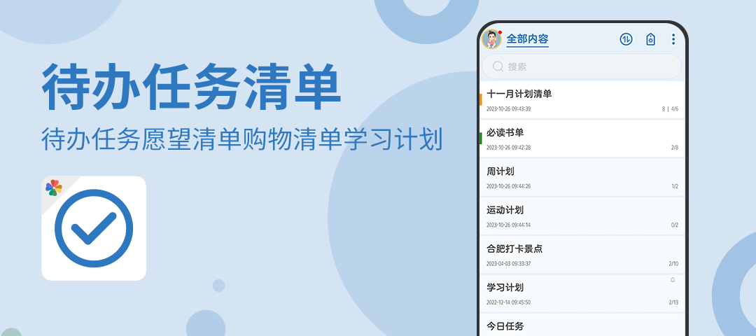 待办任务清单是一款超级好用的待办任务管理应用,帮助您管理学习计划、待办任务和各种清单,提升效率,避免遗忘。您可以将它用于学习计划、知识点管理、工作计划、任务安排、行程安排、要点记录、购物清单、愿望清单等等各种场景,是您学习、工作和生活的好帮手。